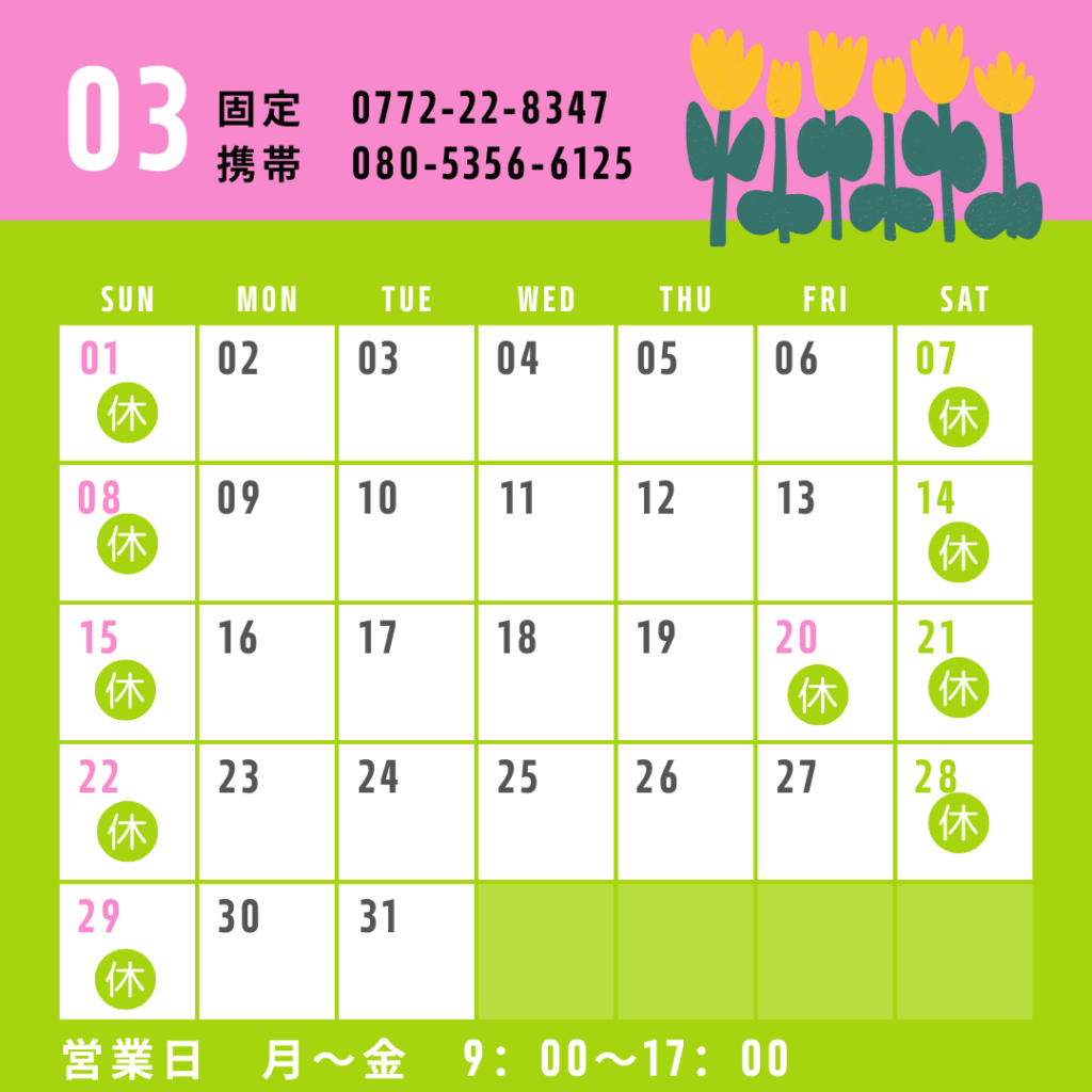 2026年3月のカレンダーです。